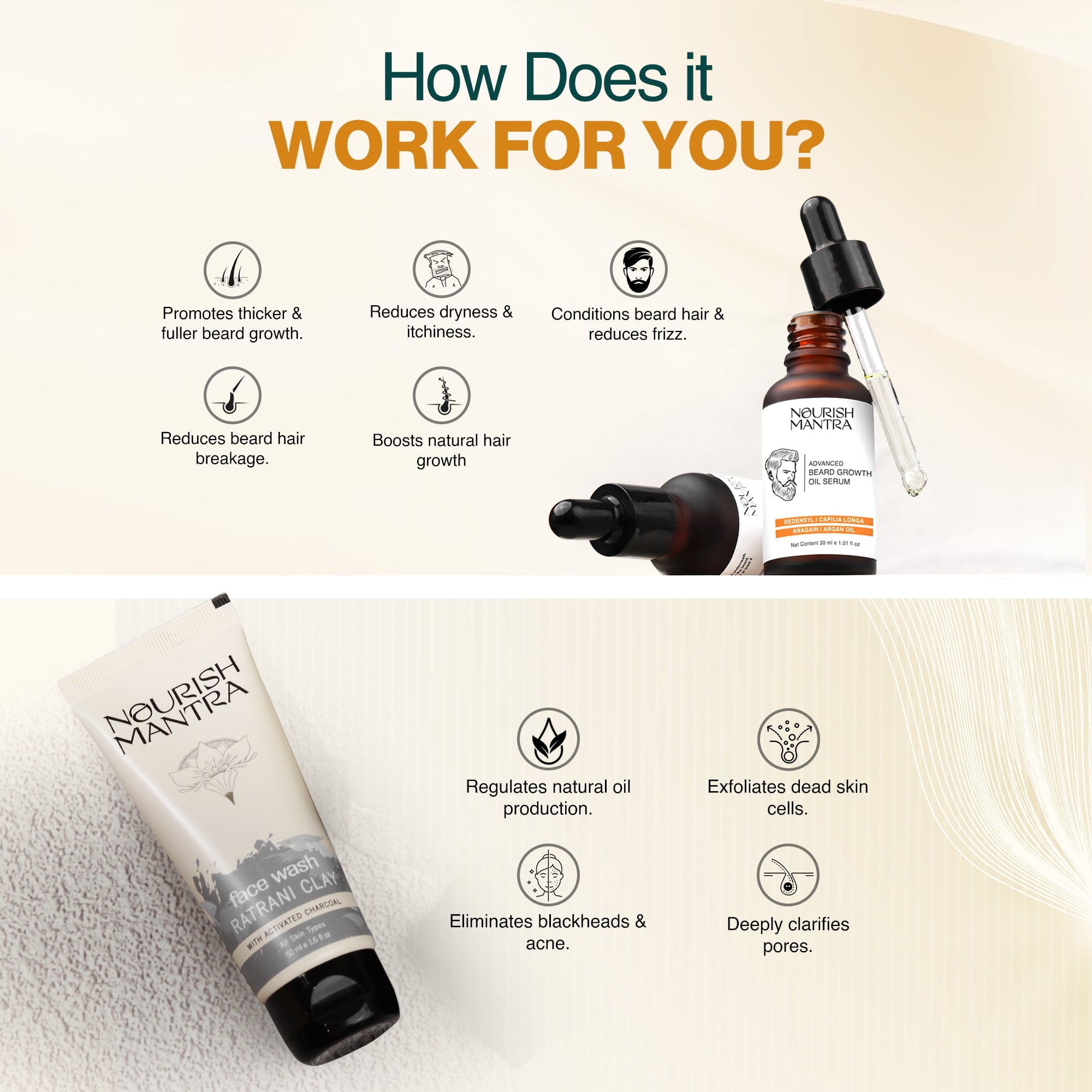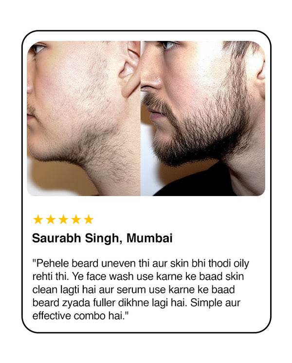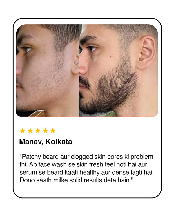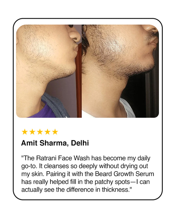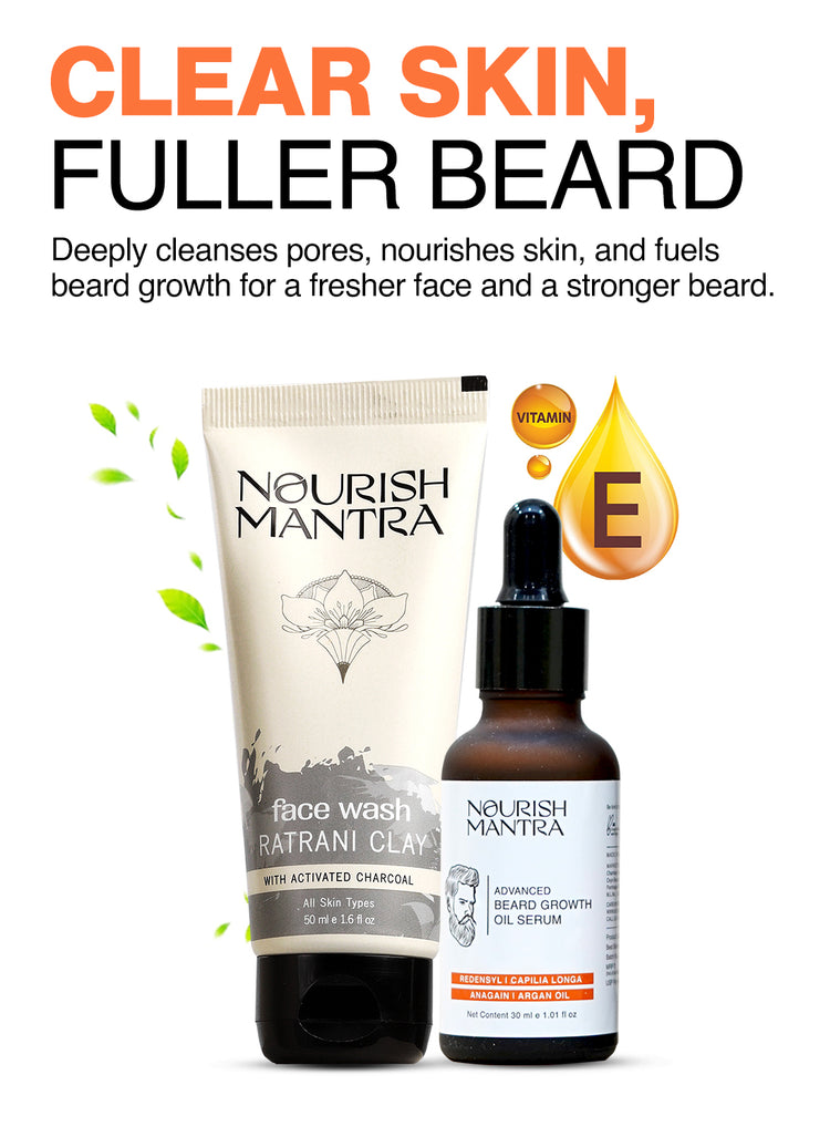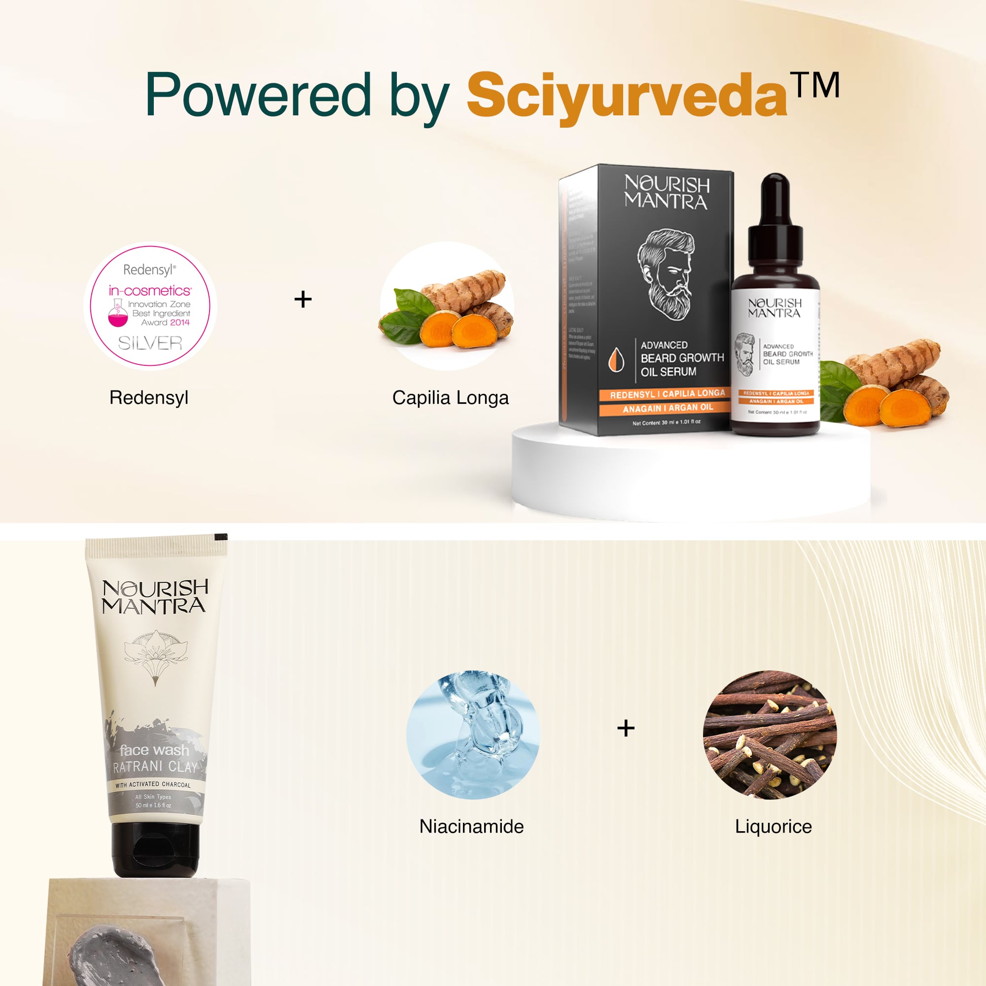 Start with the Ratrani Clay Face Wash, enriched with Moroccan & French Red Clay, Activated Charcoal, and Vitamin E. It deeply cleanses away dirt, oil, and impurities while nourishing your skin, creating the ideal base for beard care. Follow up with the Advanced Beard Growth Oil Serum, powered by Redensyl, Capilia Longa, Anagain, and Argan Oil. With a freshly cleansed face, the serum penetrates better, reactivating hair follicles, boosting growth in patchy areas, and strengthening your beard. Together, this combo keeps your skin healthy, your beard nourished, and your grooming game stronger than ever, crafted with the power of Sciyurveda™, blending the instant efficacy of modern science with the lasting benefits of Ayurveda.
