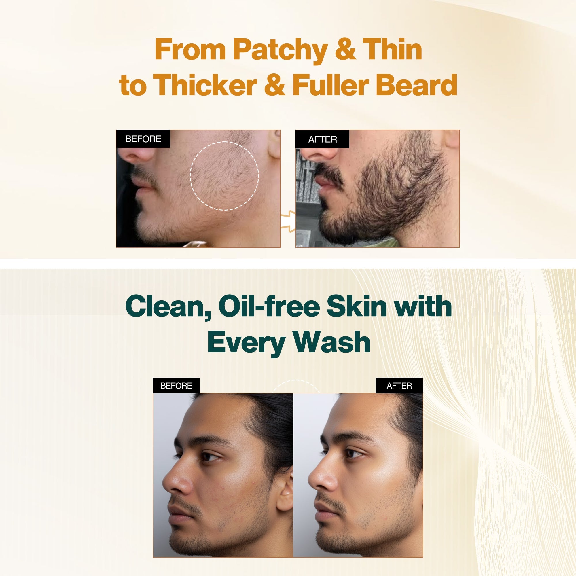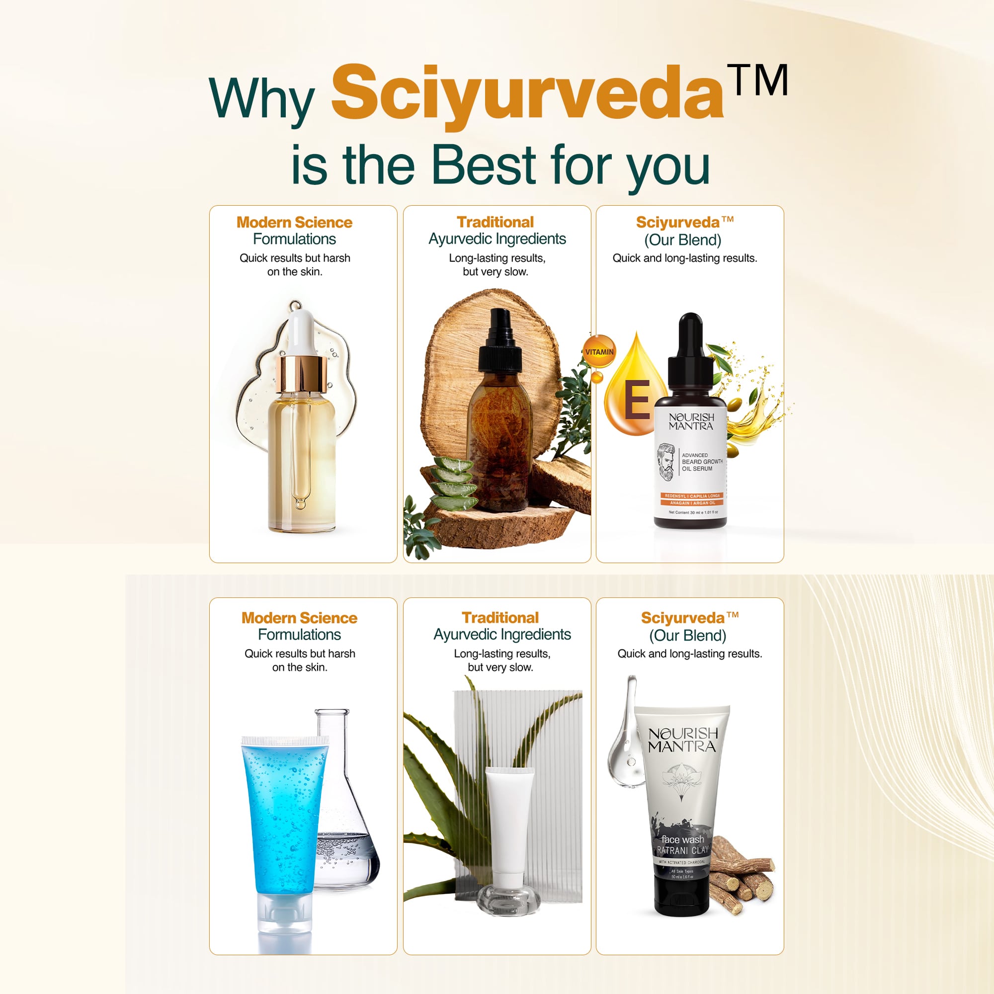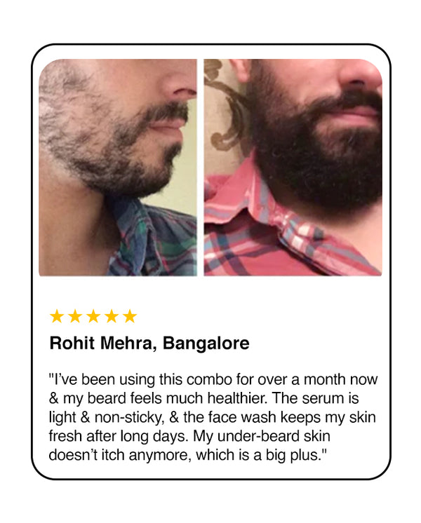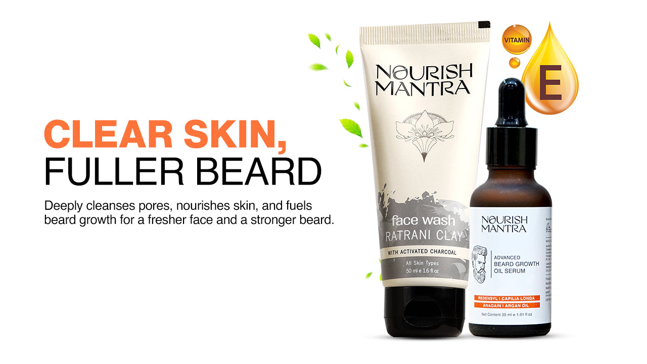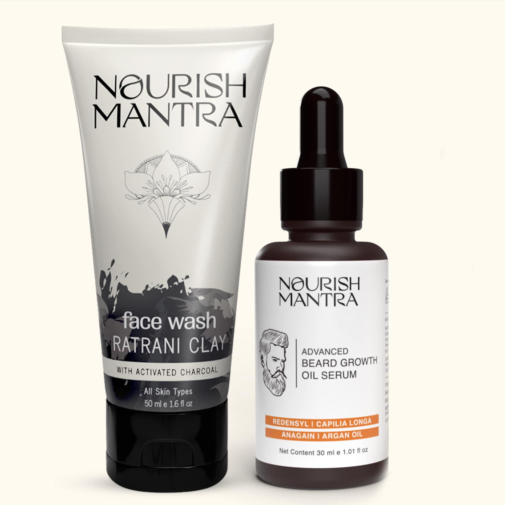 Start with the Ratrani Clay Face Wash, enriched with Moroccan & French Red Clay, Activated Charcoal, and Vitamin E. It deeply cleanses away dirt, oil, and impurities while nourishing your skin, creating the ideal base for beard care. Follow up with the Advanced Beard Growth Oil Serum, powered by Redensyl, Capilia Longa, Anagain, and Argan Oil. With a freshly cleansed face, the serum penetrates better, reactivating hair follicles, boosting growth in patchy areas, and strengthening your beard. Together, this combo keeps your skin healthy, your beard nourished, and your grooming game stronger than ever, crafted with the power of Sciyurveda™, blending the instant efficacy of modern science with the lasting benefits of Ayurveda.