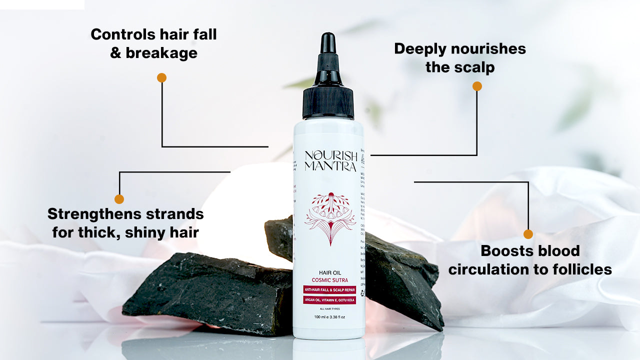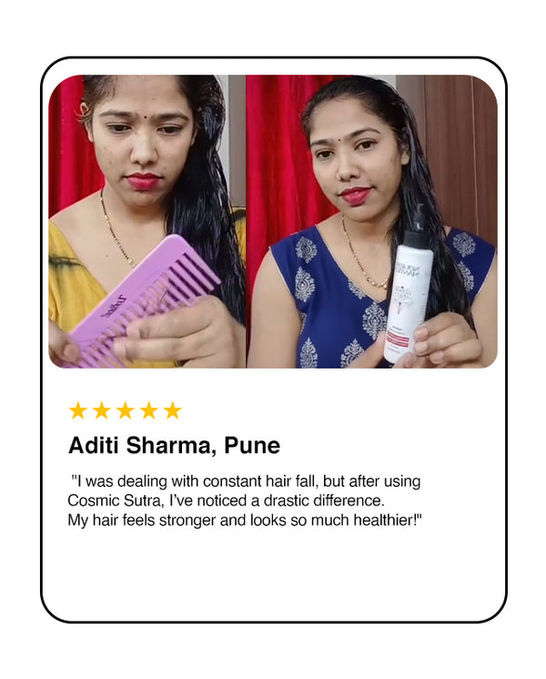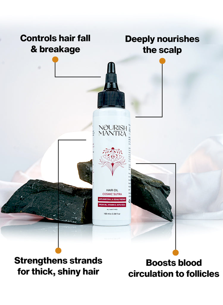 Transform your hair with Cosmic Sutra Hair Oil, a luxurious blend of Ayurvedic herbs and modern actives designed to control hair fall, strengthen strands, and deeply nourish your scalp. Infused with Argan Oil, Vitamin E, and Gotu Kola, this hair oil restores moisture balance, promotes healthy regrowth, and leaves your hair looking lush, shiny, and full of life.