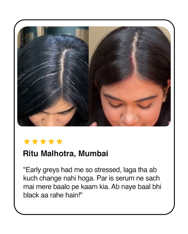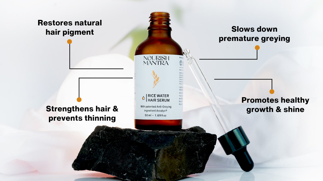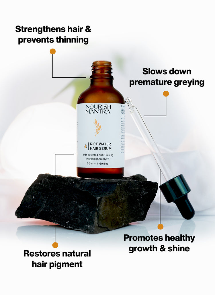 Turn back time on your tresses with Anti-Greying Rice Water Hair Serum, a breakthrough formula designed to fight premature greying and restore your natural hair pigment. Infused with the goodness of Rice Water, Acrolys, and Fenugreek Extracts, each clinically proven to combat signs of hair aging.